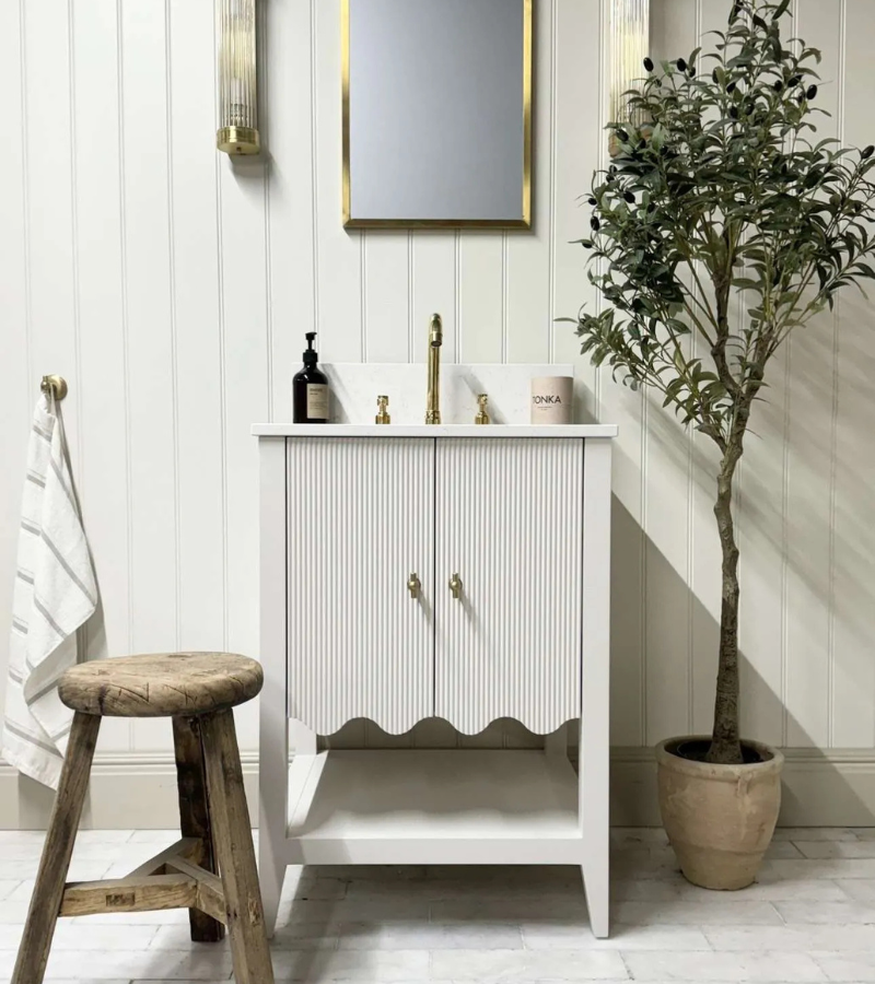 A new & exclusive range from House Nine Design. Featuring scalloped & reeding detailing. This beautiful design comes with a solid shelf & elegant tapered legs. great for kids en-suites or smaller bathrooms. Fitted with 2 doors and Blum motion soft close door hinges. Width 600mm to 800mm. Available in Oak or Painted finish.